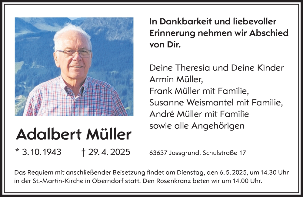 Hier finden Sie alle Traueranzeigen aus der Zeitung, die bisher für Adalbert Müller erschienen sind. Weitere Traueranzeigen, die in der Zeitung erscheinen, werden hier ebenfalls aufgelistet