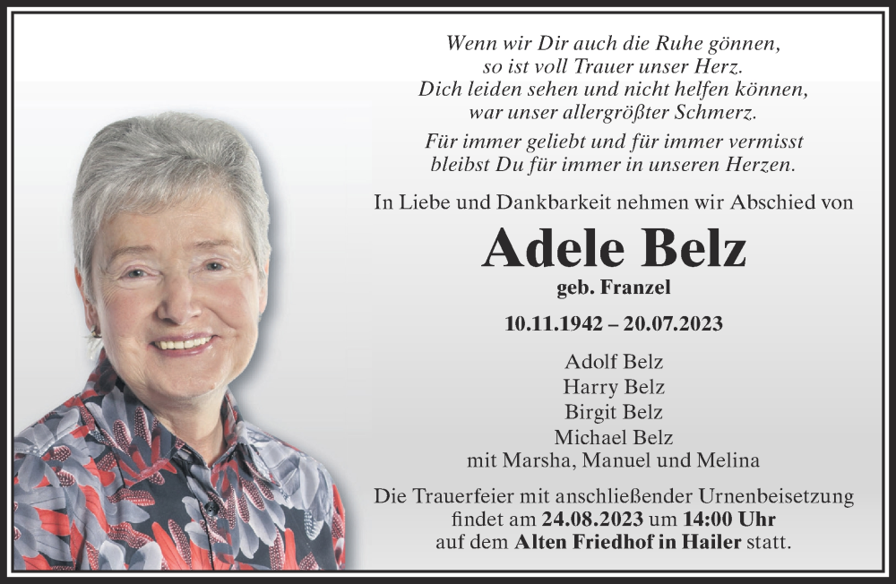 Hier finden Sie alle Traueranzeigen aus der Zeitung, die bisher für Adele Belz erschienen sind. Weitere Traueranzeigen, die in der Zeitung erscheinen, werden hier ebenfalls aufgelistet