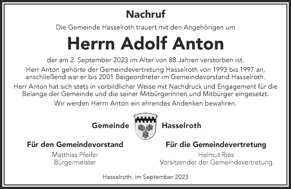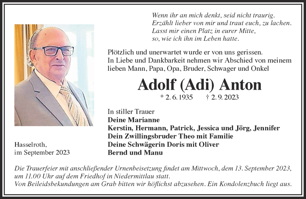 Hier finden Sie alle Traueranzeigen aus der Zeitung, die bisher für Adolf Anton erschienen sind. Weitere Traueranzeigen, die in der Zeitung erscheinen, werden hier ebenfalls aufgelistet