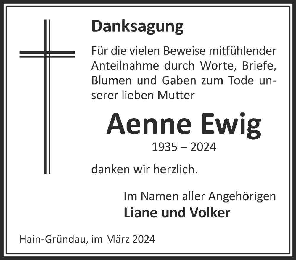 Hier finden Sie alle Traueranzeigen aus der Zeitung, die bisher für Aenne Ewig erschienen sind. Weitere Traueranzeigen, die in der Zeitung erscheinen, werden hier ebenfalls aufgelistet