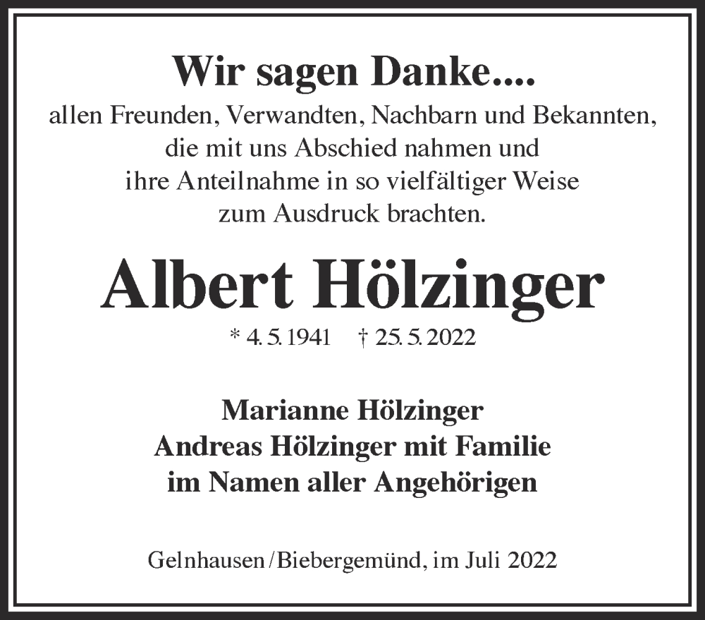 Hier finden Sie alle Traueranzeigen aus der Zeitung, die bisher für Albert Hölzinger erschienen sind. Weitere Traueranzeigen, die in der Zeitung erscheinen, werden hier ebenfalls aufgelistet