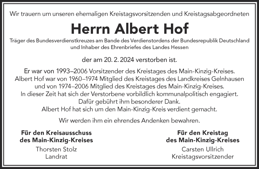 Hier finden Sie alle Traueranzeigen aus der Zeitung, die bisher für Albert Hof erschienen sind. Weitere Traueranzeigen, die in der Zeitung erscheinen, werden hier ebenfalls aufgelistet