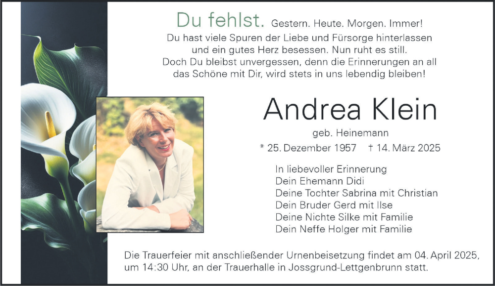 Hier finden Sie alle Traueranzeigen aus der Zeitung, die bisher für Andrea Klein erschienen sind. Weitere Traueranzeigen, die in der Zeitung erscheinen, werden hier ebenfalls aufgelistet