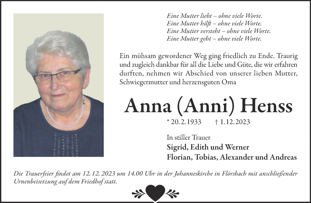 Hier finden Sie alle Traueranzeigen aus der Zeitung, die bisher für Anna Henss erschienen sind. Weitere Traueranzeigen, die in der Zeitung erscheinen, werden hier ebenfalls aufgelistet