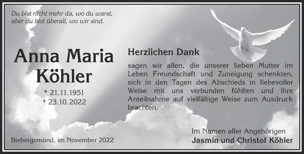 Hier finden Sie alle Traueranzeigen aus der Zeitung, die bisher für Anna Maria Köhler erschienen sind. Weitere Traueranzeigen, die in der Zeitung erscheinen, werden hier ebenfalls aufgelistet