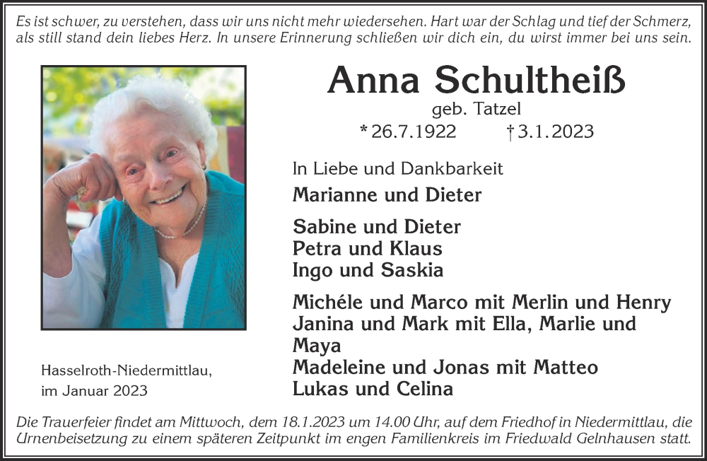 Hier finden Sie alle Traueranzeigen aus der Zeitung, die bisher für Anna Schultheiß erschienen sind. Weitere Traueranzeigen, die in der Zeitung erscheinen, werden hier ebenfalls aufgelistet