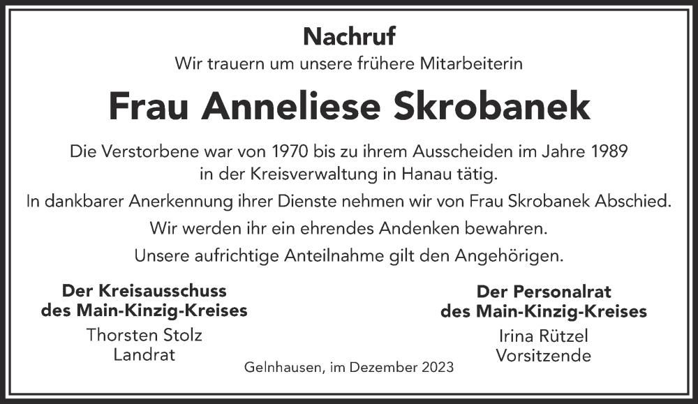 Hier finden Sie alle Traueranzeigen aus der Zeitung, die bisher für Anneliese Skrobanek erschienen sind. Weitere Traueranzeigen, die in der Zeitung erscheinen, werden hier ebenfalls aufgelistet