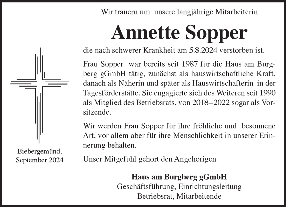 Hier finden Sie alle Traueranzeigen aus der Zeitung, die bisher für Annette Sopper erschienen sind. Weitere Traueranzeigen, die in der Zeitung erscheinen, werden hier ebenfalls aufgelistet