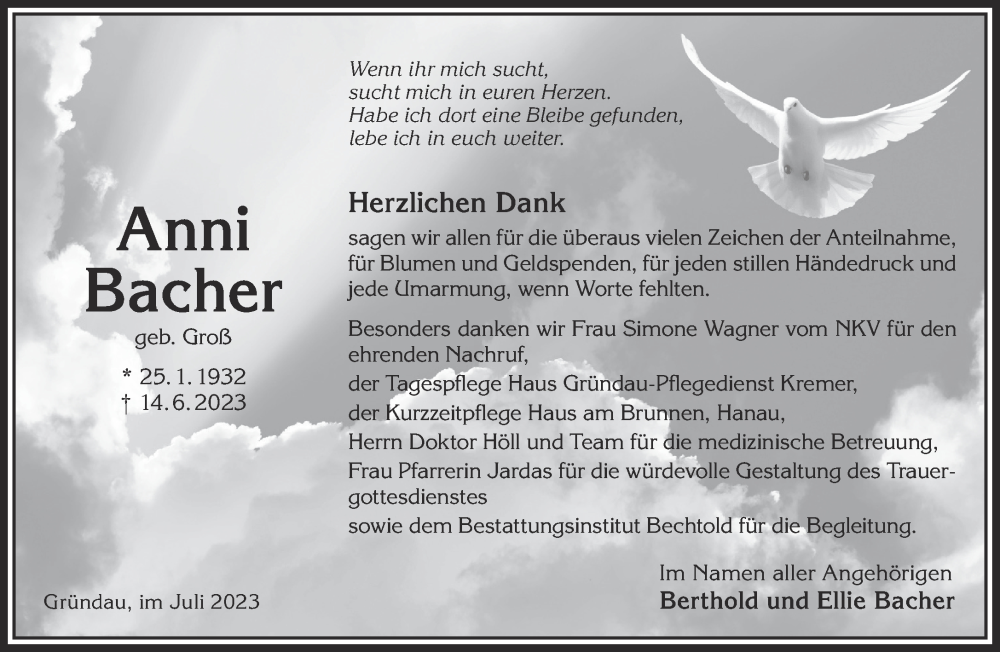 Hier finden Sie alle Traueranzeigen aus der Zeitung, die bisher für Anni Bacher erschienen sind. Weitere Traueranzeigen, die in der Zeitung erscheinen, werden hier ebenfalls aufgelistet