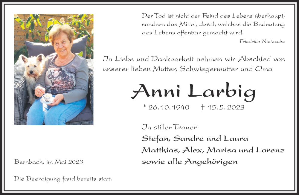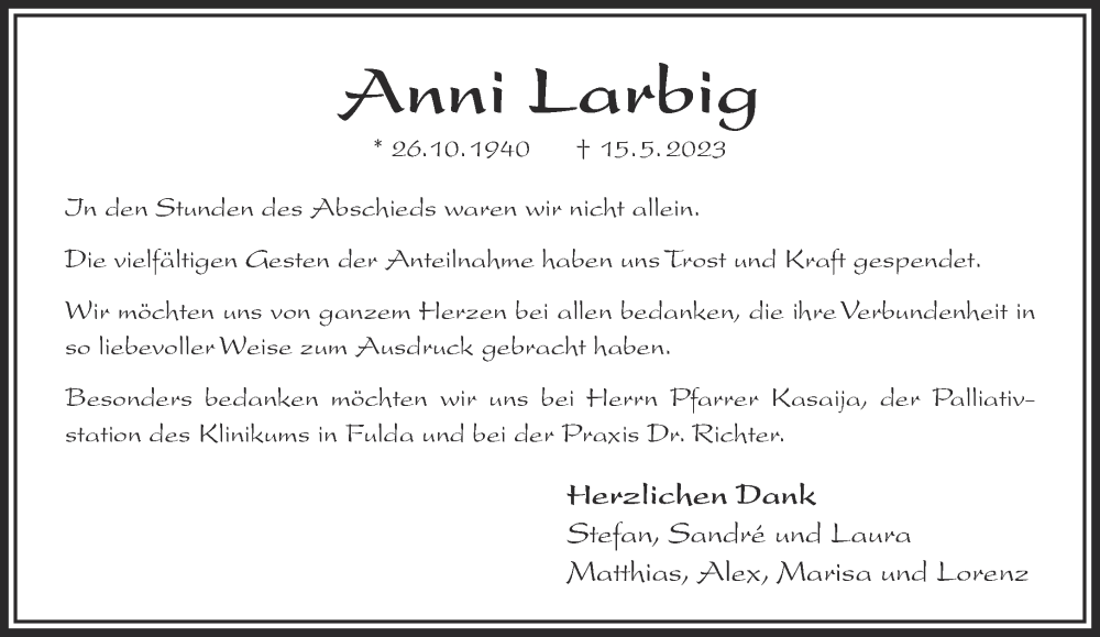 Hier finden Sie alle Traueranzeigen aus der Zeitung, die bisher für Anni Larbig erschienen sind. Weitere Traueranzeigen, die in der Zeitung erscheinen, werden hier ebenfalls aufgelistet