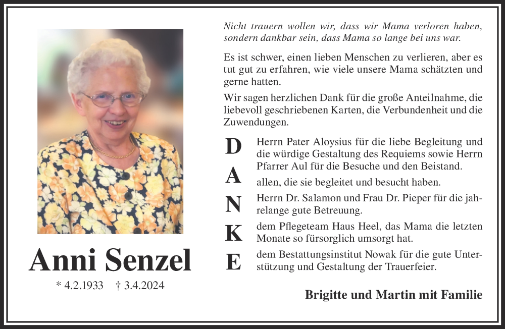 Hier finden Sie alle Traueranzeigen aus der Zeitung, die bisher für Anni Senzel erschienen sind. Weitere Traueranzeigen, die in der Zeitung erscheinen, werden hier ebenfalls aufgelistet