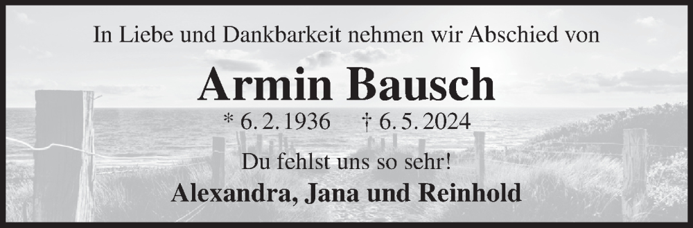 Hier finden Sie alle Traueranzeigen aus der Zeitung, die bisher für Armin Bausch erschienen sind. Weitere Traueranzeigen, die in der Zeitung erscheinen, werden hier ebenfalls aufgelistet