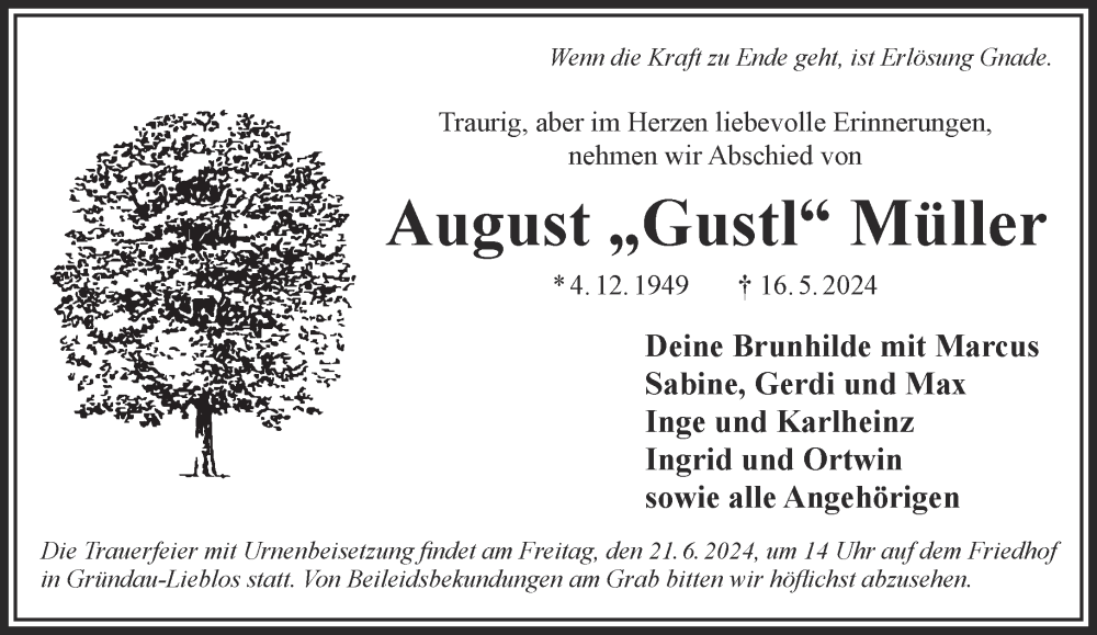 Hier finden Sie alle Traueranzeigen aus der Zeitung, die bisher für August Müller erschienen sind. Weitere Traueranzeigen, die in der Zeitung erscheinen, werden hier ebenfalls aufgelistet