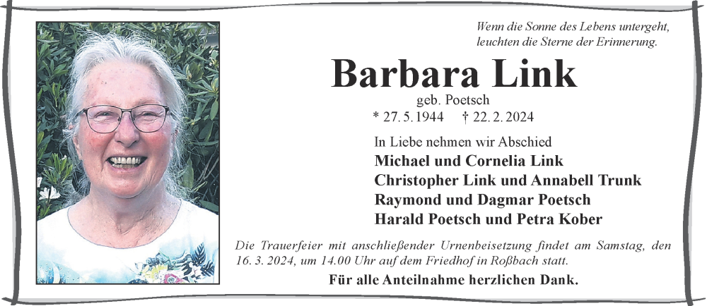 Hier finden Sie alle Traueranzeigen aus der Zeitung, die bisher für Barbara Link erschienen sind. Weitere Traueranzeigen, die in der Zeitung erscheinen, werden hier ebenfalls aufgelistet