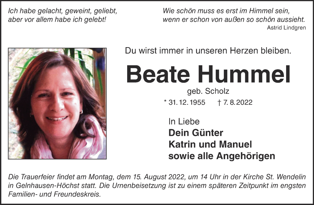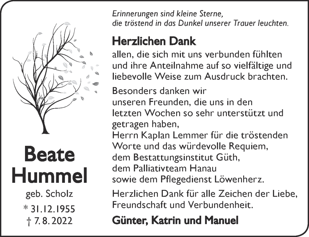 Hier finden Sie alle Traueranzeigen aus der Zeitung, die bisher für Beate Hummel erschienen sind. Weitere Traueranzeigen, die in der Zeitung erscheinen, werden hier ebenfalls aufgelistet
