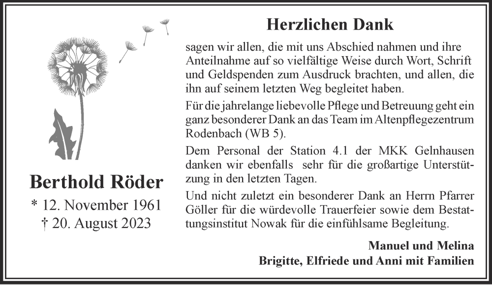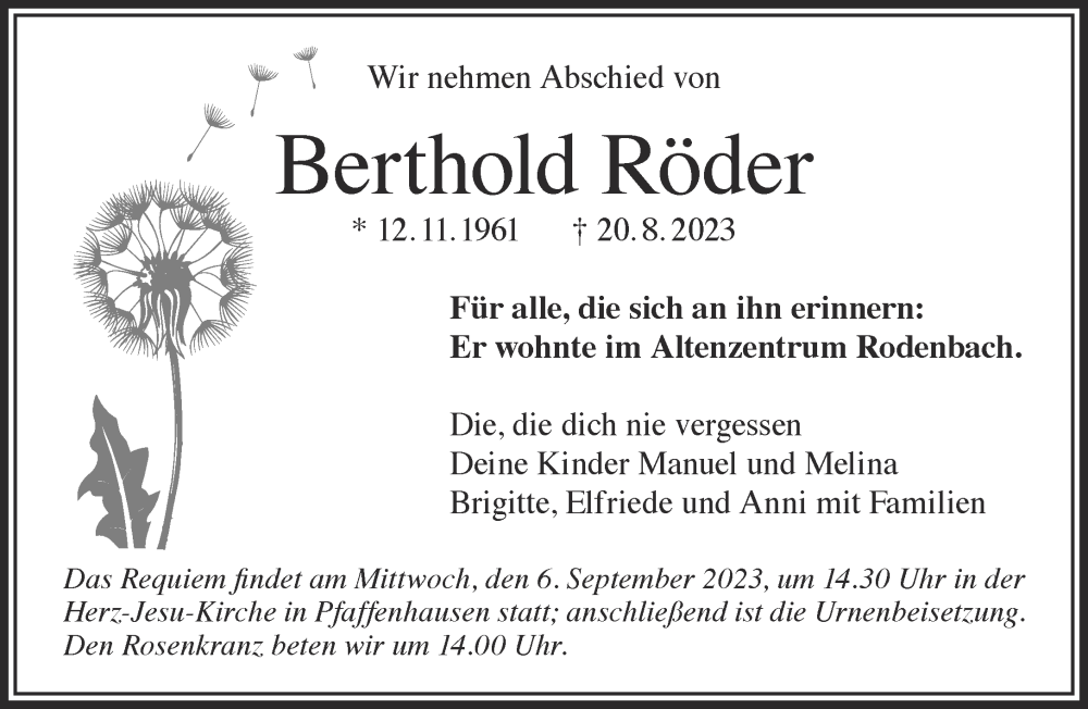 Hier finden Sie alle Traueranzeigen aus der Zeitung, die bisher für Berthold Röder erschienen sind. Weitere Traueranzeigen, die in der Zeitung erscheinen, werden hier ebenfalls aufgelistet