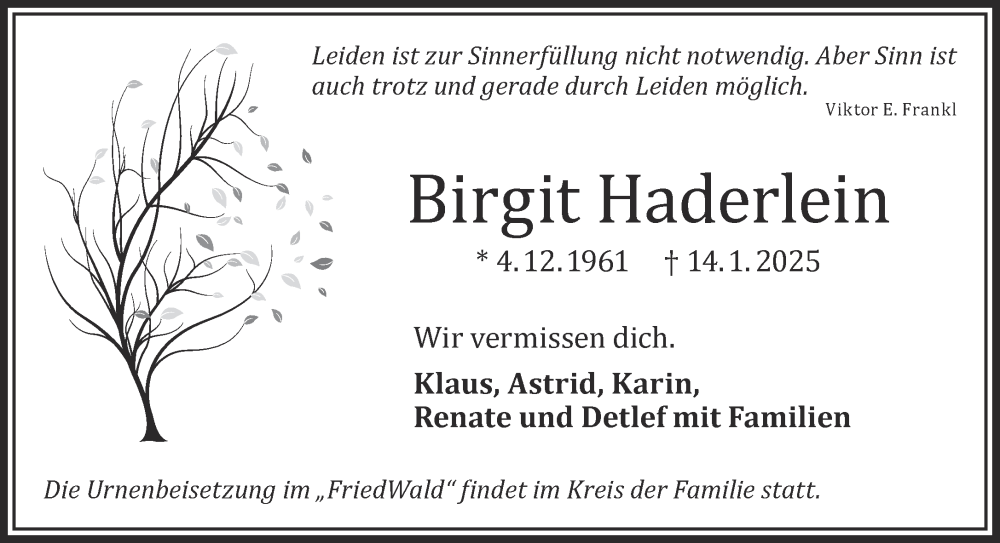 Hier finden Sie alle Traueranzeigen aus der Zeitung, die bisher für Birgit Haderlein erschienen sind. Weitere Traueranzeigen, die in der Zeitung erscheinen, werden hier ebenfalls aufgelistet