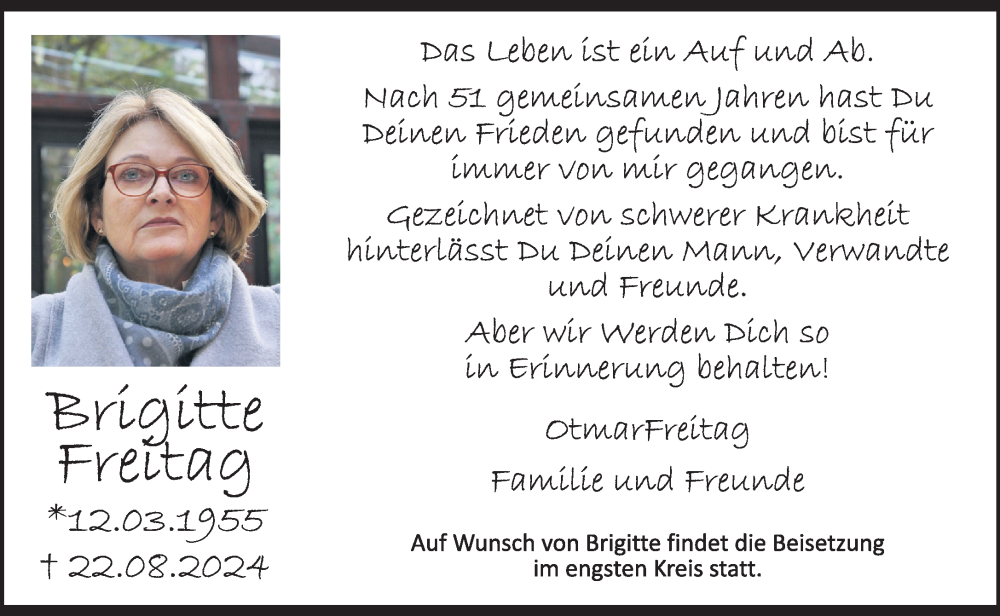 Hier finden Sie alle Traueranzeigen aus der Zeitung, die bisher für Brigitte Freitag erschienen sind. Weitere Traueranzeigen, die in der Zeitung erscheinen, werden hier ebenfalls aufgelistet