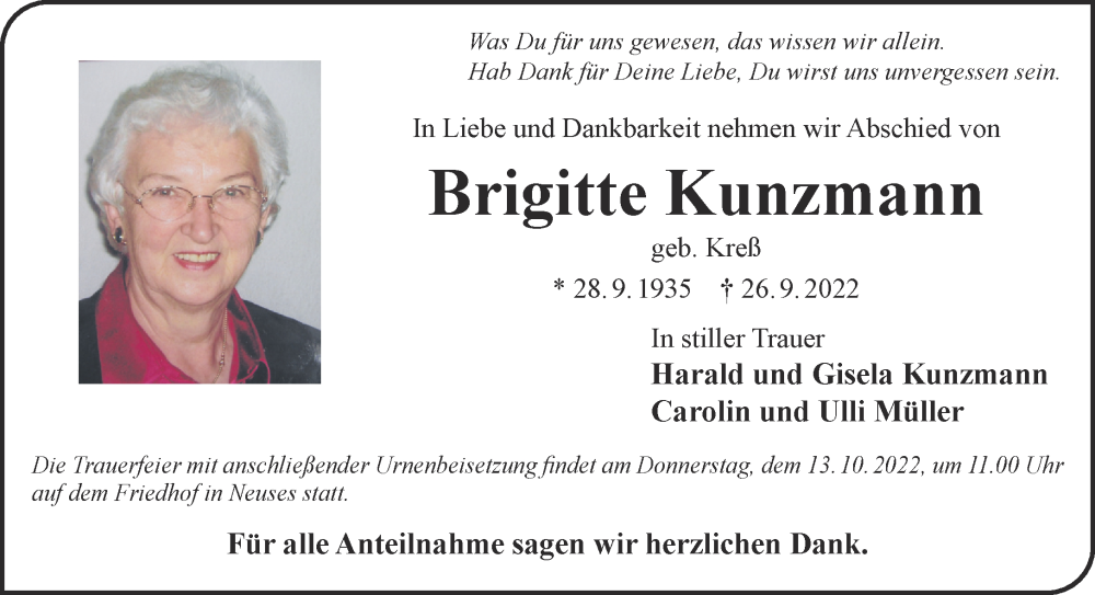 Hier finden Sie alle Traueranzeigen aus der Zeitung, die bisher für Brigitte Kunzmann erschienen sind. Weitere Traueranzeigen, die in der Zeitung erscheinen, werden hier ebenfalls aufgelistet