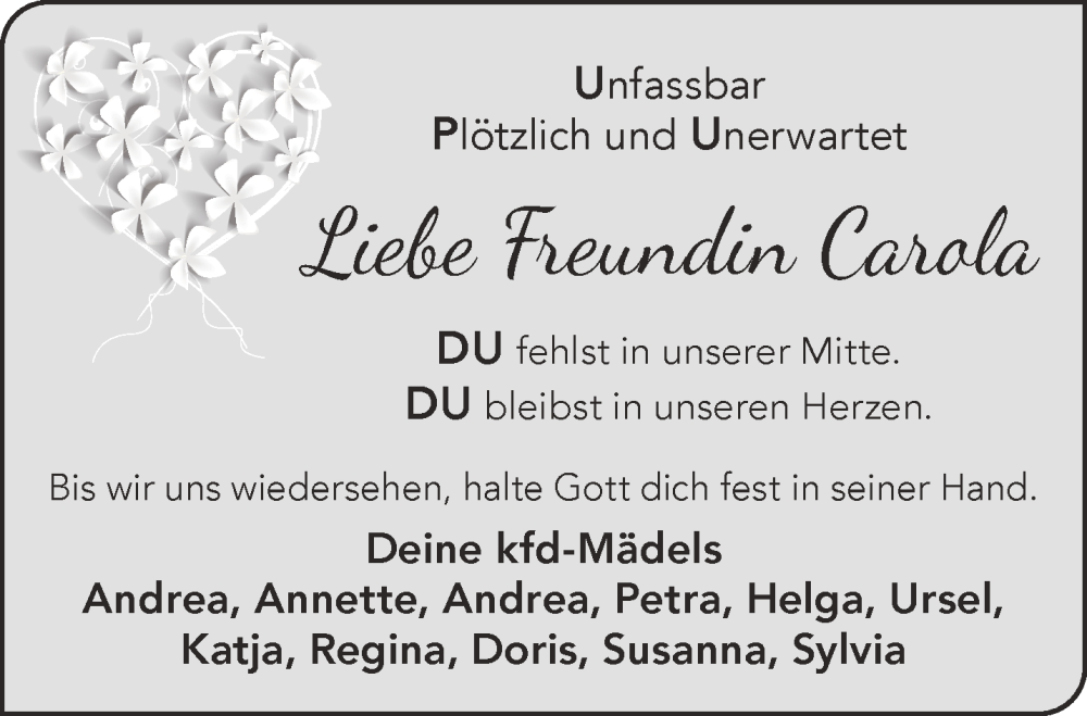 Hier finden Sie alle Traueranzeigen aus der Zeitung, die bisher für Carola erschienen sind. Weitere Traueranzeigen, die in der Zeitung erscheinen, werden hier ebenfalls aufgelistet