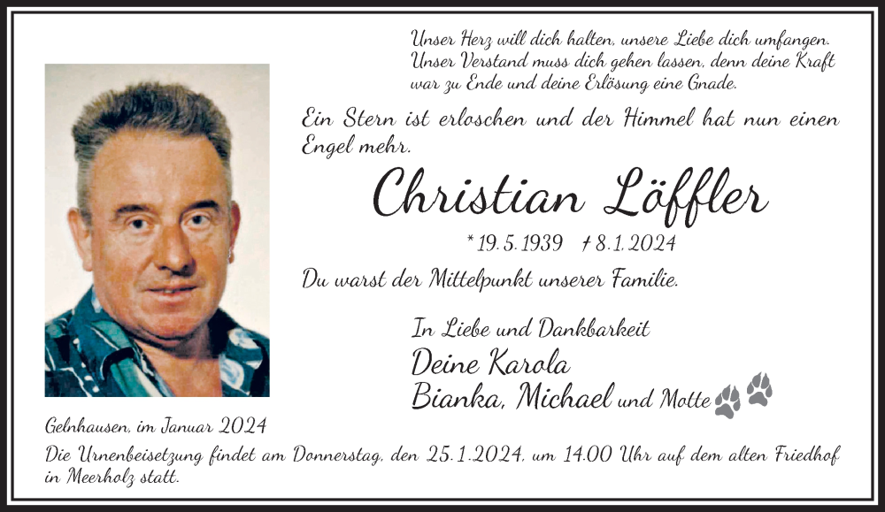 Hier finden Sie alle Traueranzeigen aus der Zeitung, die bisher für Cauiliart otä erschienen sind. Weitere Traueranzeigen, die in der Zeitung erscheinen, werden hier ebenfalls aufgelistet