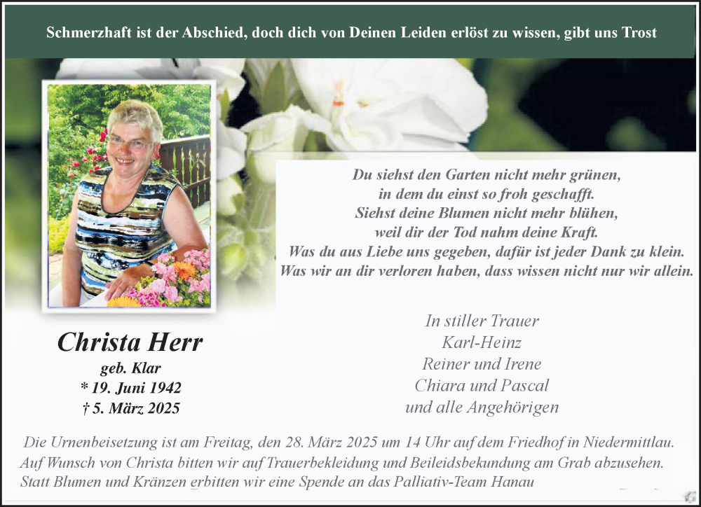 Hier finden Sie alle Traueranzeigen aus der Zeitung, die bisher für Christa Herr erschienen sind. Weitere Traueranzeigen, die in der Zeitung erscheinen, werden hier ebenfalls aufgelistet