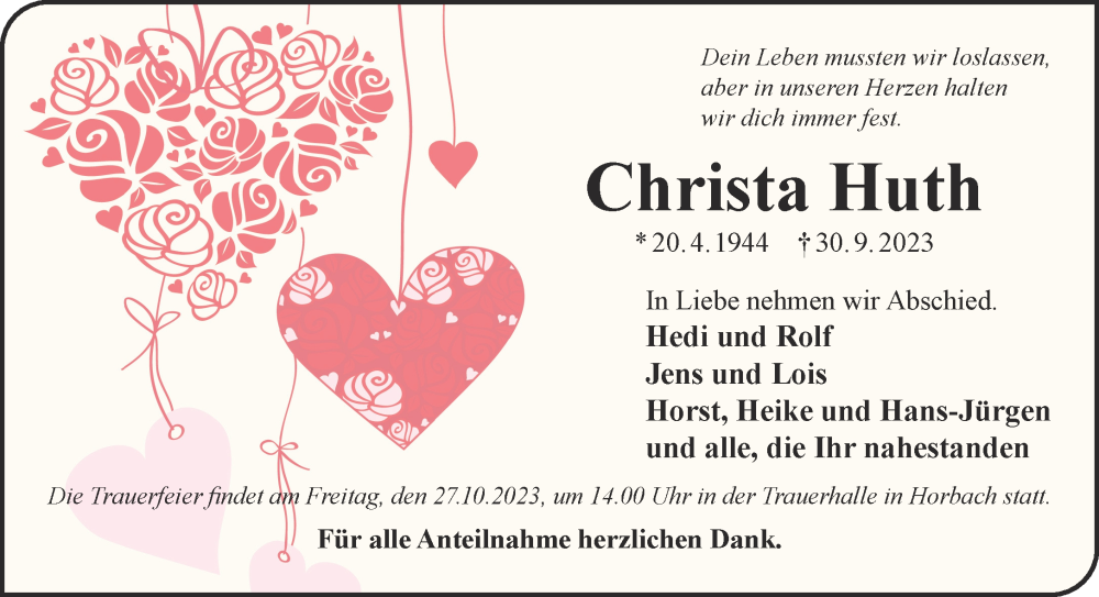 Hier finden Sie alle Traueranzeigen aus der Zeitung, die bisher für Christa Huth erschienen sind. Weitere Traueranzeigen, die in der Zeitung erscheinen, werden hier ebenfalls aufgelistet