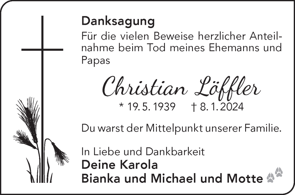 Hier finden Sie alle Traueranzeigen aus der Zeitung, die bisher für Christian Löffler erschienen sind. Weitere Traueranzeigen, die in der Zeitung erscheinen, werden hier ebenfalls aufgelistet