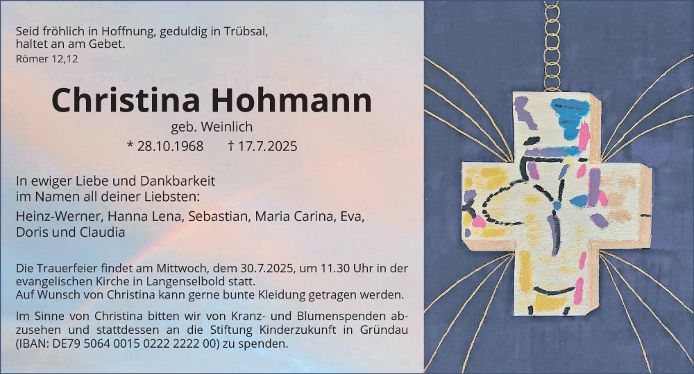 Hier finden Sie alle Traueranzeigen aus der Zeitung, die bisher für Christina Hohmann erschienen sind. Weitere Traueranzeigen, die in der Zeitung erscheinen, werden hier ebenfalls aufgelistet