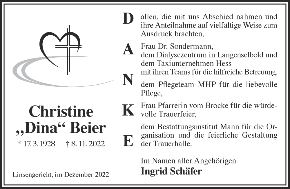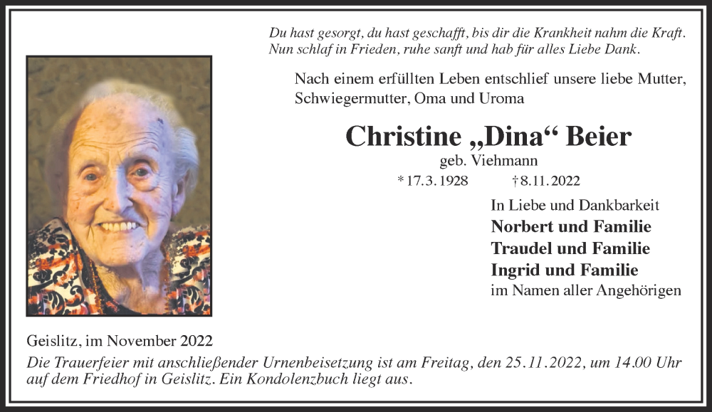 Hier finden Sie alle Traueranzeigen aus der Zeitung, die bisher für Christine Beier erschienen sind. Weitere Traueranzeigen, die in der Zeitung erscheinen, werden hier ebenfalls aufgelistet