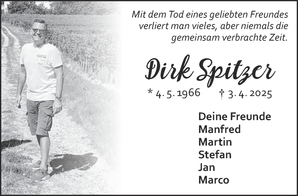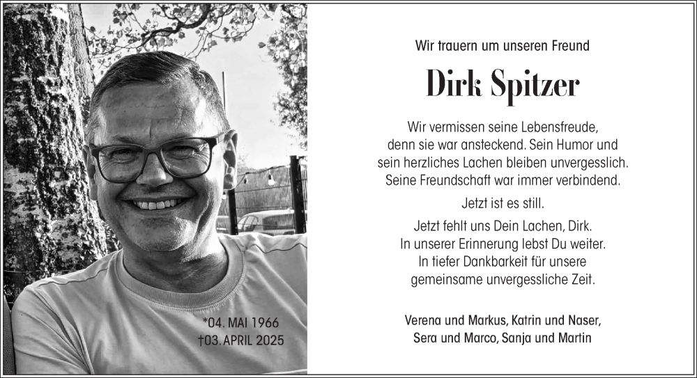 Hier finden Sie alle Traueranzeigen aus der Zeitung, die bisher für Dirk Spitzer erschienen sind. Weitere Traueranzeigen, die in der Zeitung erscheinen, werden hier ebenfalls aufgelistet