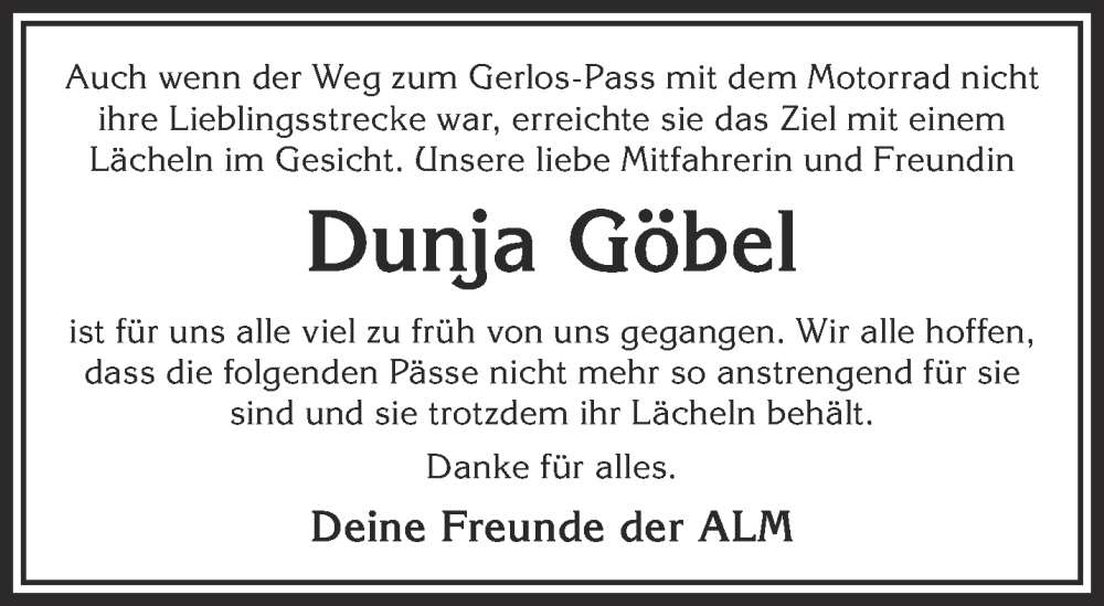 Hier finden Sie alle Traueranzeigen aus der Zeitung, die bisher für Dunja Göbel erschienen sind. Weitere Traueranzeigen, die in der Zeitung erscheinen, werden hier ebenfalls aufgelistet