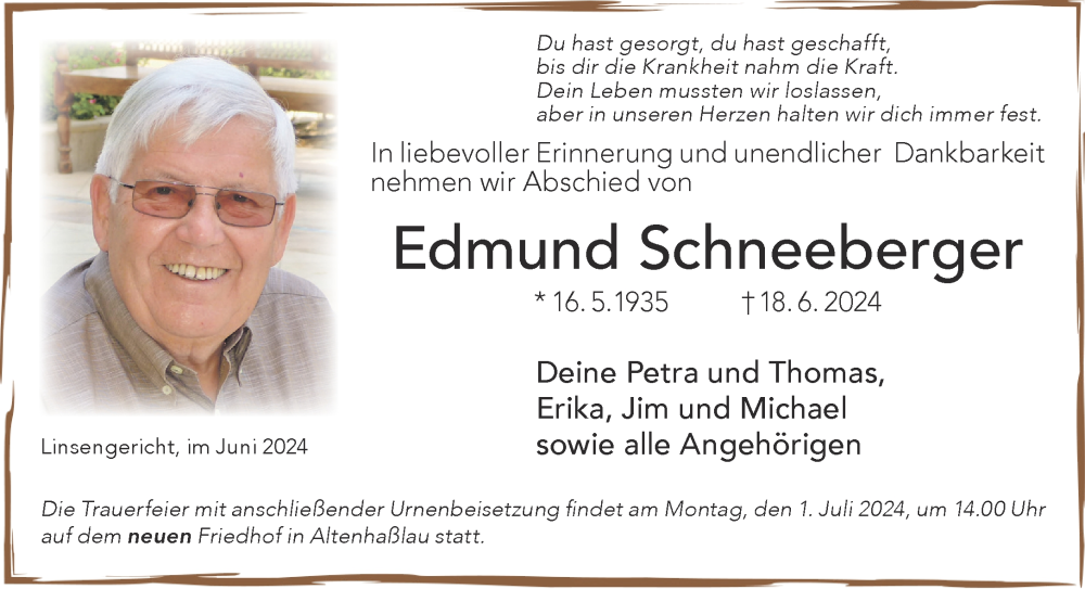 Hier finden Sie alle Traueranzeigen aus der Zeitung, die bisher für Edmund Schneeberger erschienen sind. Weitere Traueranzeigen, die in der Zeitung erscheinen, werden hier ebenfalls aufgelistet