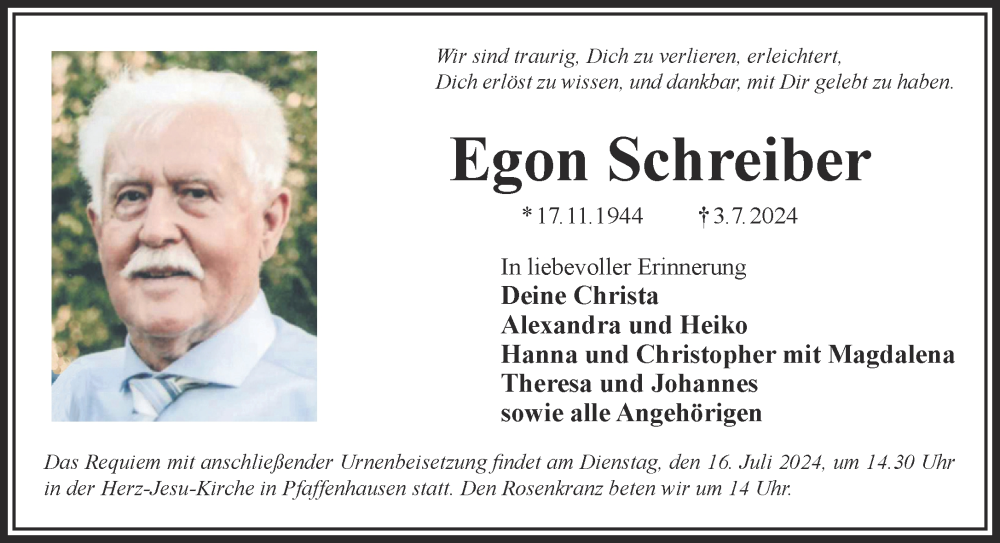Hier finden Sie alle Traueranzeigen aus der Zeitung, die bisher für Egon Schreiber erschienen sind. Weitere Traueranzeigen, die in der Zeitung erscheinen, werden hier ebenfalls aufgelistet