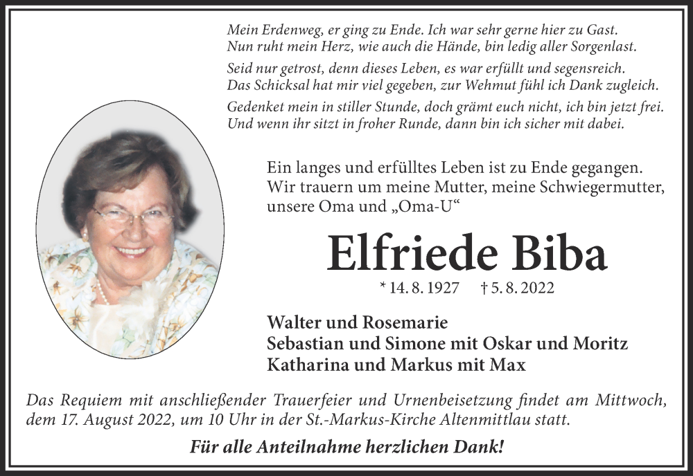 Hier finden Sie alle Traueranzeigen aus der Zeitung, die bisher für Elfriede Biba erschienen sind. Weitere Traueranzeigen, die in der Zeitung erscheinen, werden hier ebenfalls aufgelistet