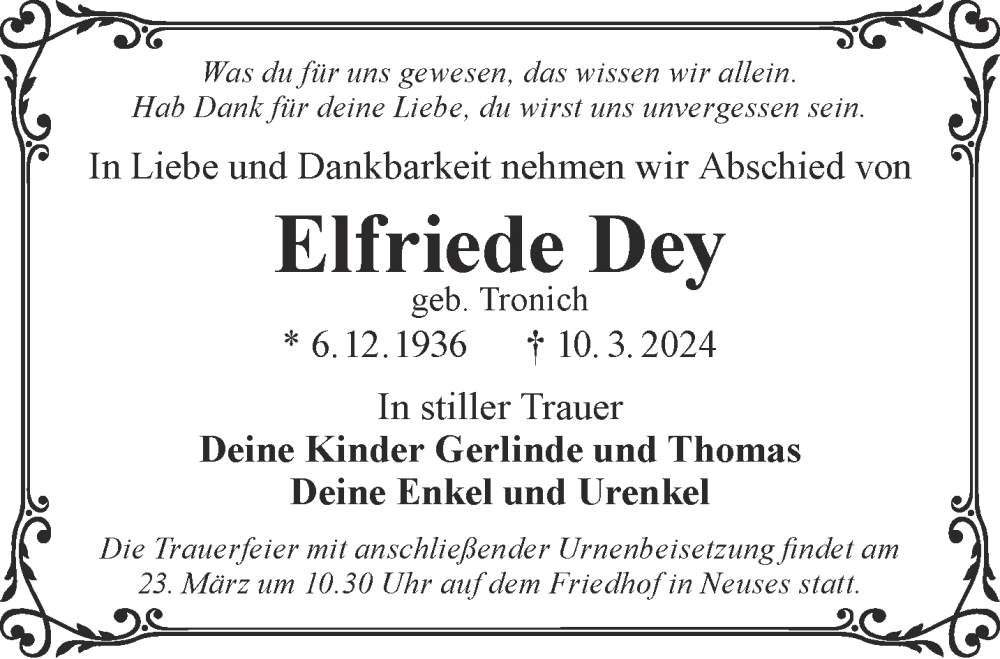 Hier finden Sie alle Traueranzeigen aus der Zeitung, die bisher für Elfriede Dey erschienen sind. Weitere Traueranzeigen, die in der Zeitung erscheinen, werden hier ebenfalls aufgelistet