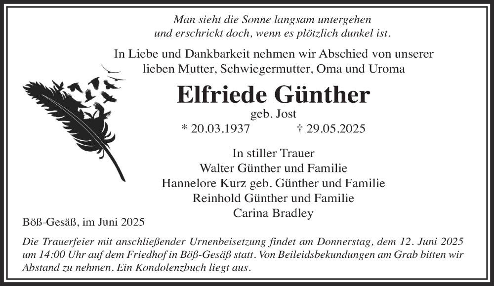 Hier finden Sie alle Traueranzeigen aus der Zeitung, die bisher für Elfriede Günther erschienen sind. Weitere Traueranzeigen, die in der Zeitung erscheinen, werden hier ebenfalls aufgelistet