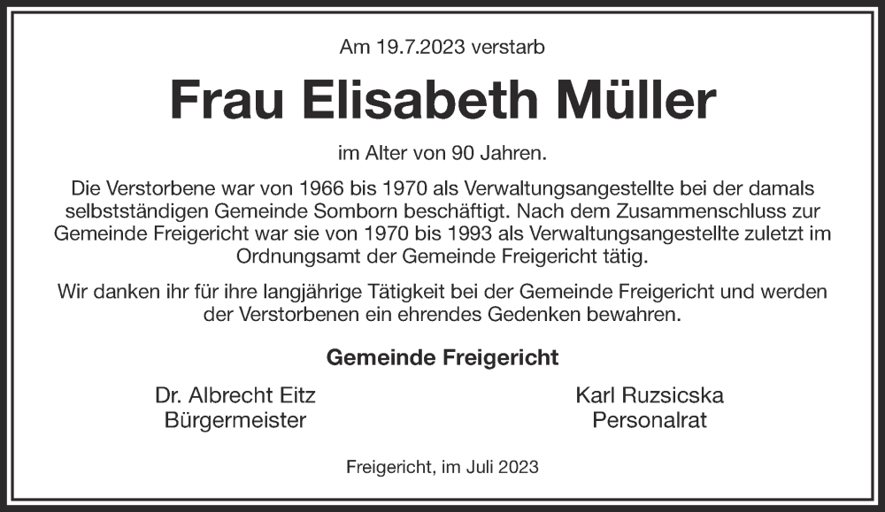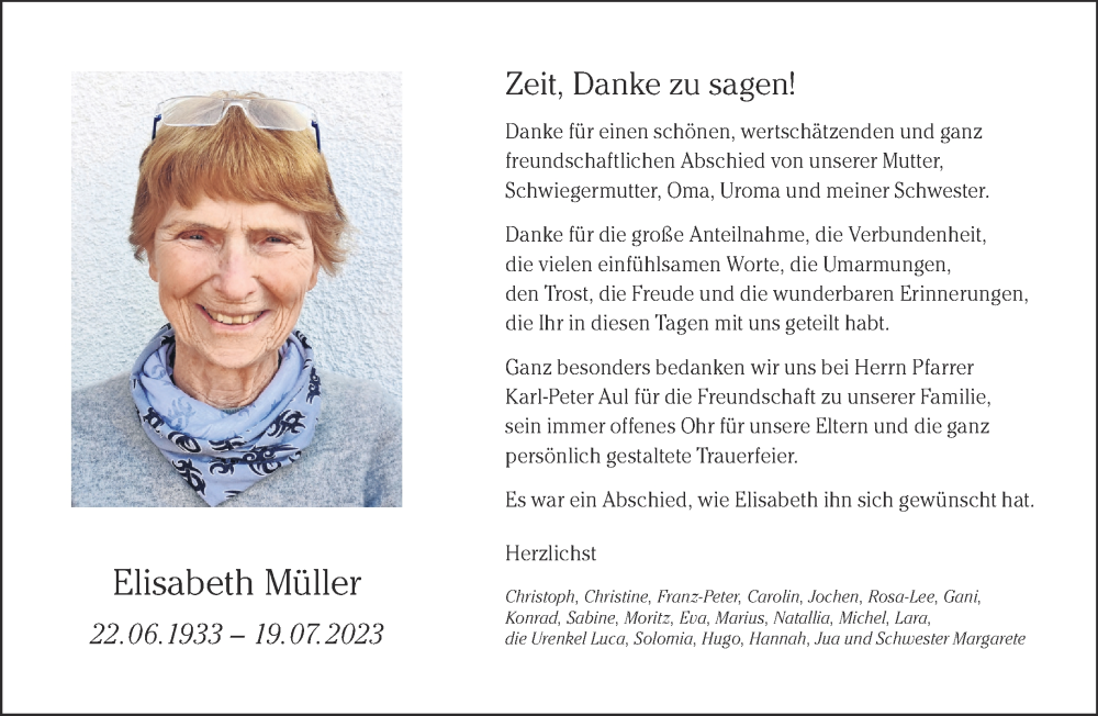 Hier finden Sie alle Traueranzeigen aus der Zeitung, die bisher für Elisabeth Müller erschienen sind. Weitere Traueranzeigen, die in der Zeitung erscheinen, werden hier ebenfalls aufgelistet