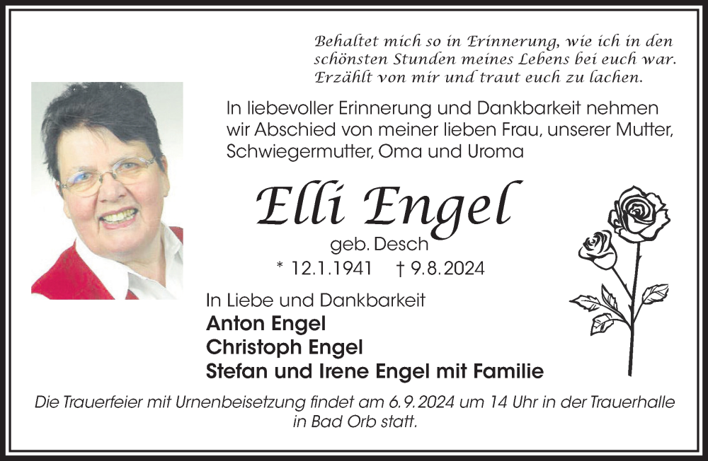 Hier finden Sie alle Traueranzeigen aus der Zeitung, die bisher für Elli Engel erschienen sind. Weitere Traueranzeigen, die in der Zeitung erscheinen, werden hier ebenfalls aufgelistet