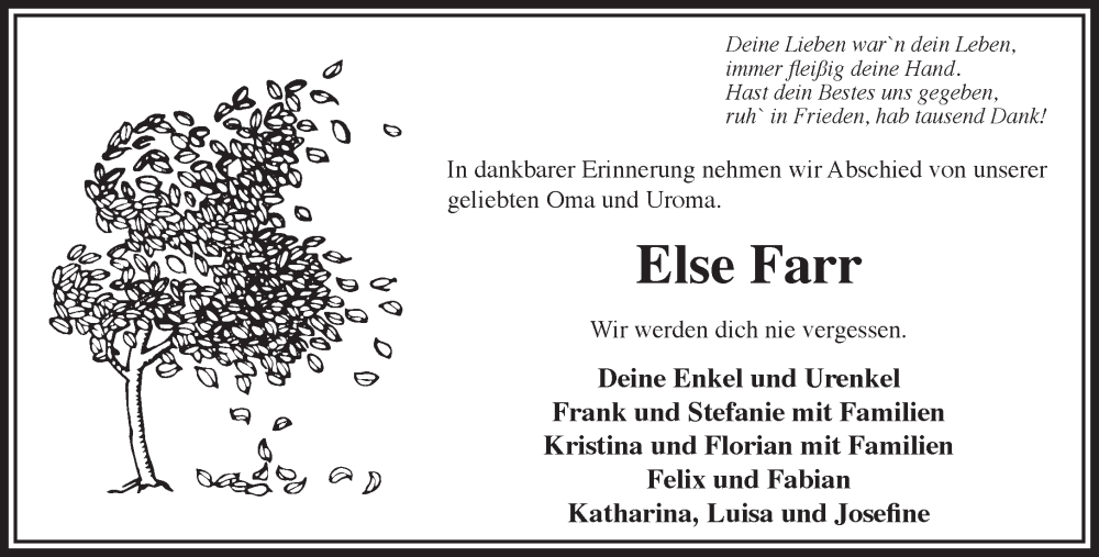 Hier finden Sie alle Traueranzeigen aus der Zeitung, die bisher für Else Farr erschienen sind. Weitere Traueranzeigen, die in der Zeitung erscheinen, werden hier ebenfalls aufgelistet