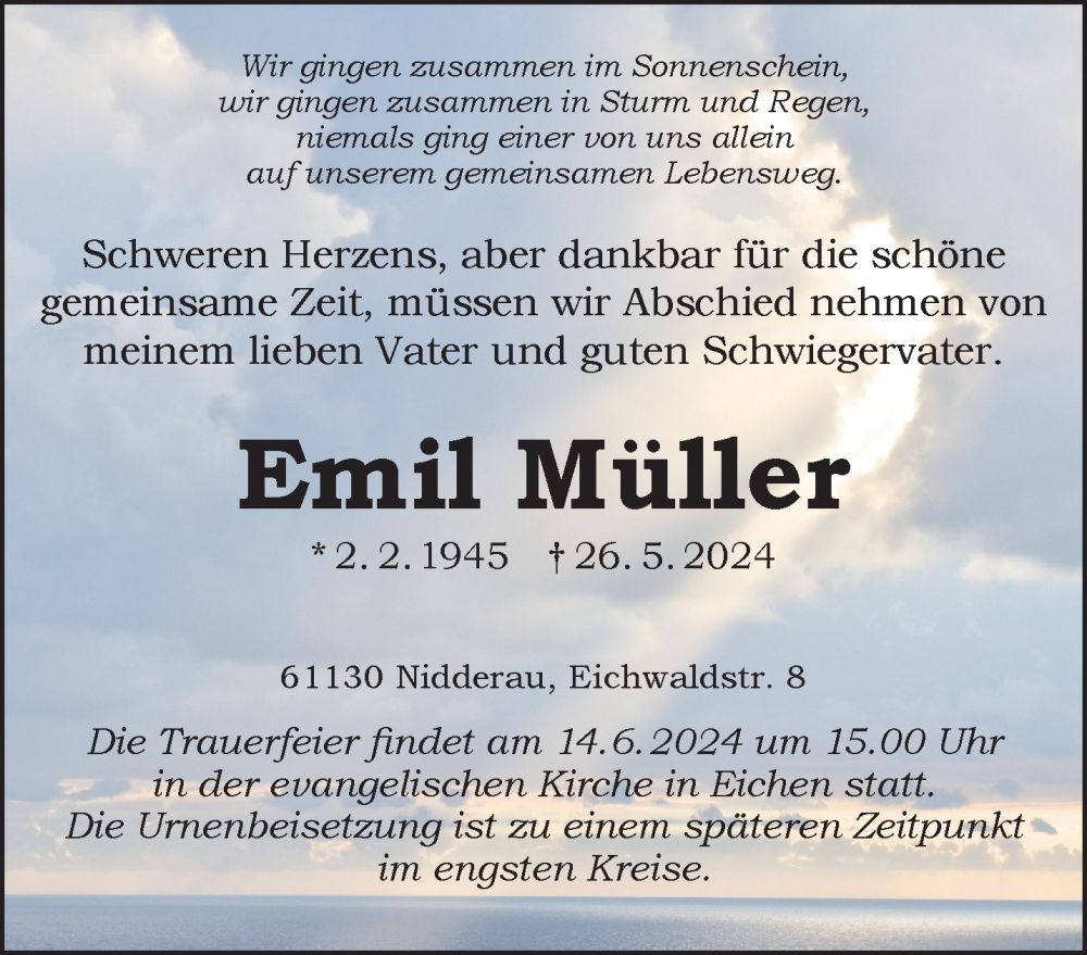 Hier finden Sie alle Traueranzeigen aus der Zeitung, die bisher für Emil Müller erschienen sind. Weitere Traueranzeigen, die in der Zeitung erscheinen, werden hier ebenfalls aufgelistet
