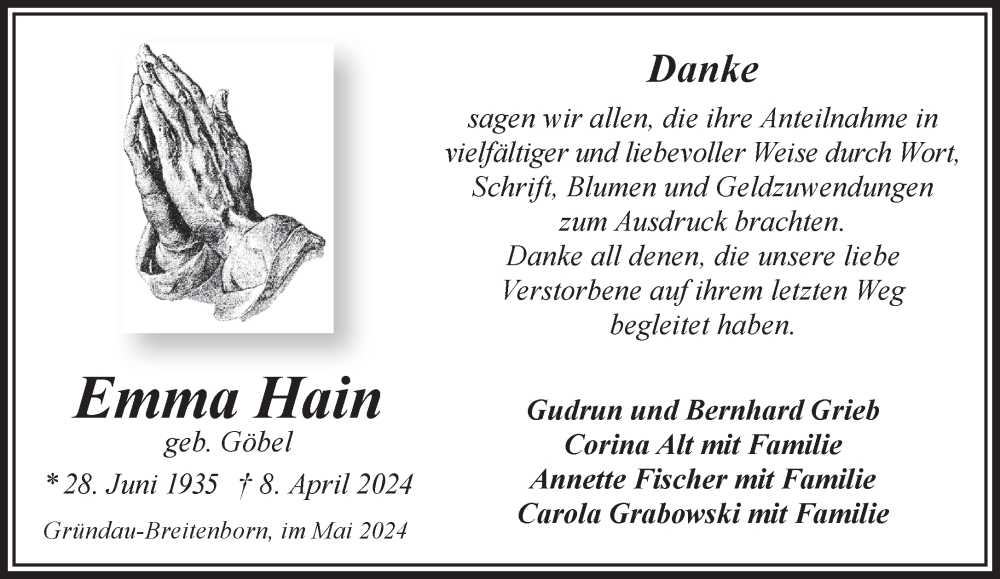 Hier finden Sie alle Traueranzeigen aus der Zeitung, die bisher für Emma Hain erschienen sind. Weitere Traueranzeigen, die in der Zeitung erscheinen, werden hier ebenfalls aufgelistet