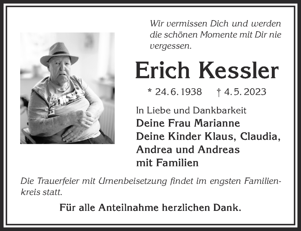 Hier finden Sie alle Traueranzeigen aus der Zeitung, die bisher für Erich Kessler erschienen sind. Weitere Traueranzeigen, die in der Zeitung erscheinen, werden hier ebenfalls aufgelistet