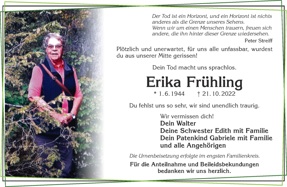 Hier finden Sie alle Traueranzeigen aus der Zeitung, die bisher für Erika Frühling erschienen sind. Weitere Traueranzeigen, die in der Zeitung erscheinen, werden hier ebenfalls aufgelistet