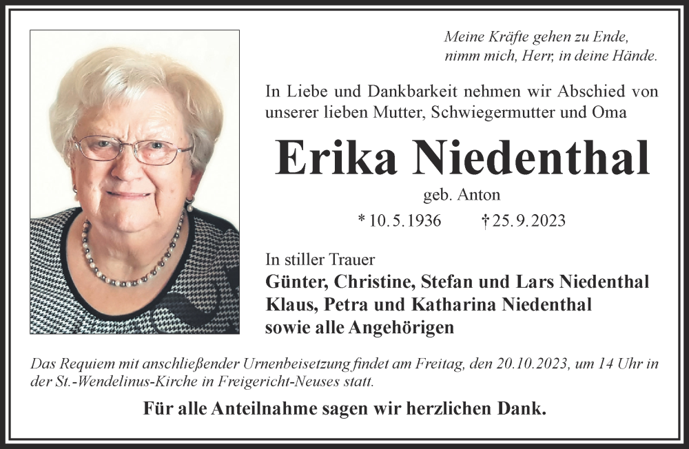 Hier finden Sie alle Traueranzeigen aus der Zeitung, die bisher für Erika Niedenthal erschienen sind. Weitere Traueranzeigen, die in der Zeitung erscheinen, werden hier ebenfalls aufgelistet