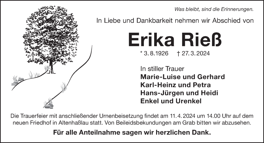 Hier finden Sie alle Traueranzeigen aus der Zeitung, die bisher für Erika Rieß erschienen sind. Weitere Traueranzeigen, die in der Zeitung erscheinen, werden hier ebenfalls aufgelistet