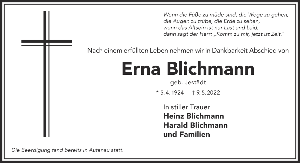 Hier finden Sie alle Traueranzeigen aus der Zeitung, die bisher für Erna Blichmann erschienen sind. Weitere Traueranzeigen, die in der Zeitung erscheinen, werden hier ebenfalls aufgelistet