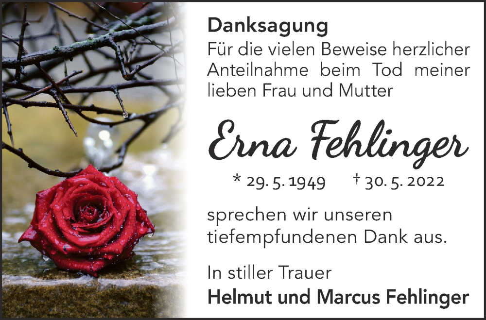 Hier finden Sie alle Traueranzeigen aus der Zeitung, die bisher für Erna Fehlinger erschienen sind. Weitere Traueranzeigen, die in der Zeitung erscheinen, werden hier ebenfalls aufgelistet