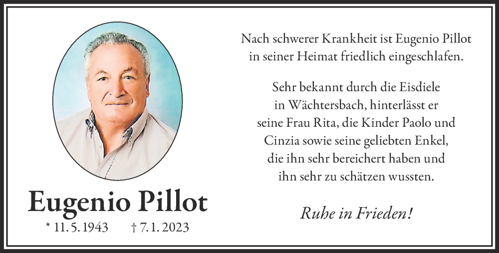 Hier finden Sie alle Traueranzeigen aus der Zeitung, die bisher für Eugenio Pillot erschienen sind. Weitere Traueranzeigen, die in der Zeitung erscheinen, werden hier ebenfalls aufgelistet