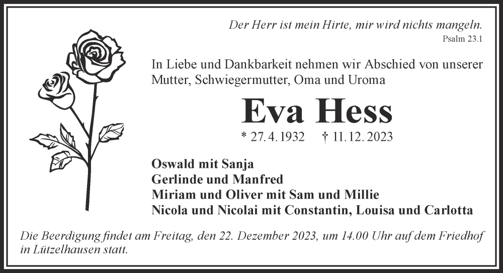 Hier finden Sie alle Traueranzeigen aus der Zeitung, die bisher für Eva Hess erschienen sind. Weitere Traueranzeigen, die in der Zeitung erscheinen, werden hier ebenfalls aufgelistet